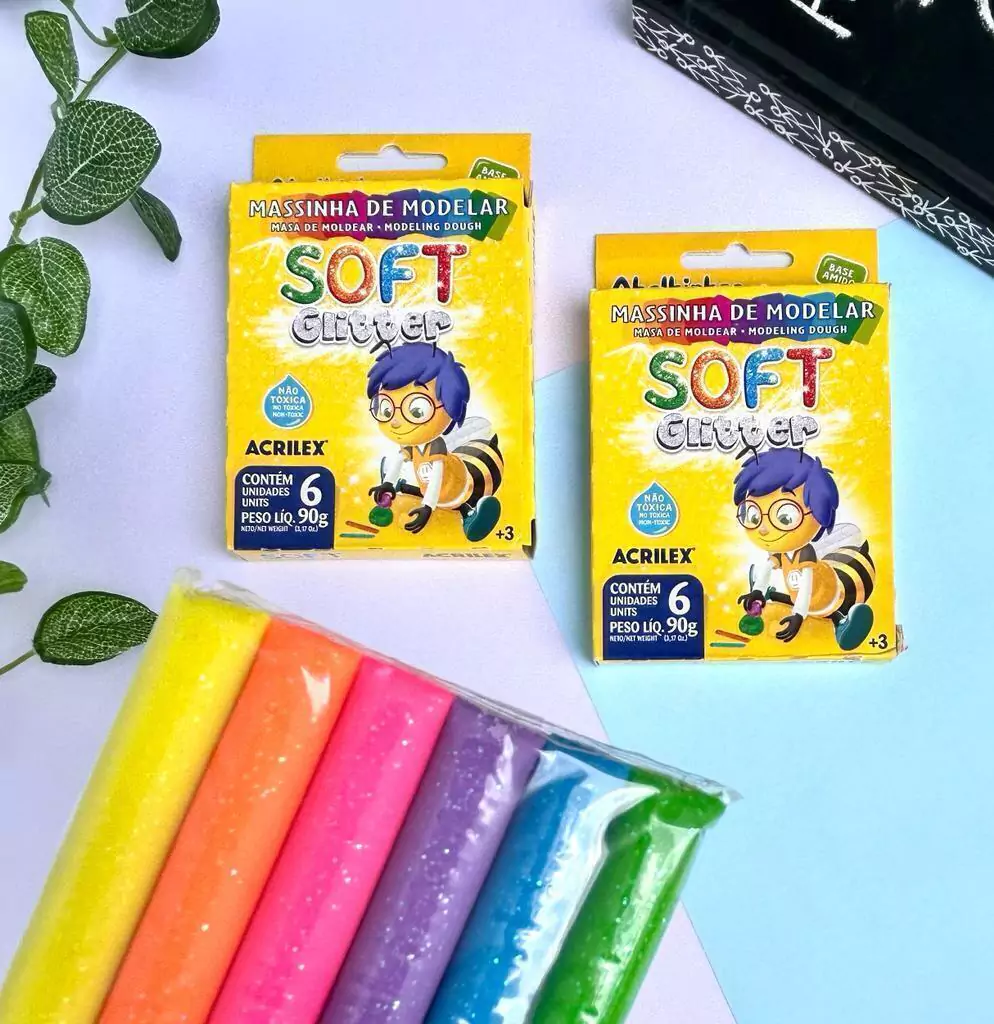 Explore um mundo de cores com a Massinha de Modelar Soft Glitter com 6 cores.